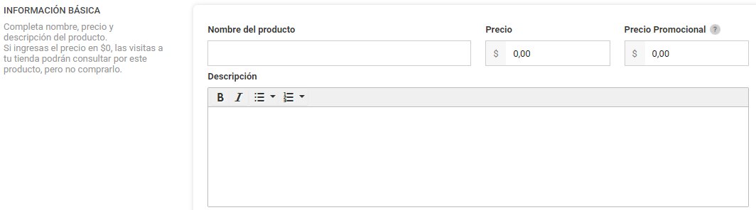 - Descripción: Describe tus productos de forma detallada para que el cliente conozca todas sus características para que decida comprarlo. Si eres un revendedor, no uses la descripción exacta que brinda el fabricante, ya que te perjudicará en el posicionamiento en los motores de búsqueda.