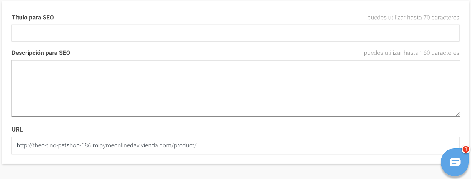 - Título del producto para SEO: introduce un título que sea descriptivo de tu producto. Se mostrará como un enlace en los resultados del motor de búsqueda.