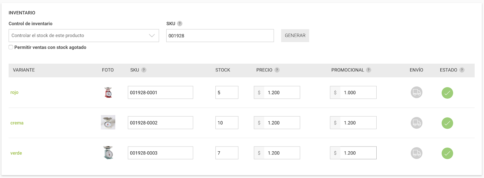 SKU (Stock Keeping Unit): cada producto (y sus variantes) tendrá un código único, para que puedas individualizarlos y encontrarlos rápidamente entre todo el stock. Puedes optar por escribir un código propio o generar uno automáticamente, presionando el botón Generar.