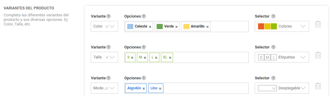 Puedes agregar hasta tres variantes por producto. En el caso de las remeras, realizamos una variante para el color, otra para el talle y otra para el modelo: