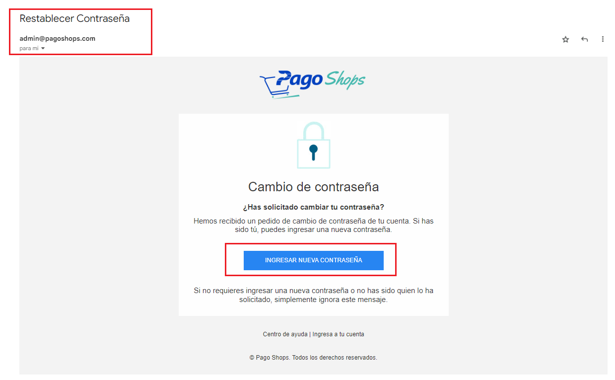 Luego de hacer clic en recuperar contraseña se te enviará un correo con el Asunto -Restablecer contraseña. Sólo deberás hacer clic sobre el botón Ingresar nueva contraseña como lo indica aquí: