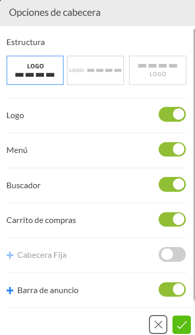 Si no quieres mostrar tu logo en la cabecera (no te recomendamos hacerlo), puedes ingresar a las opciones de la cabecera y desactivarlo.